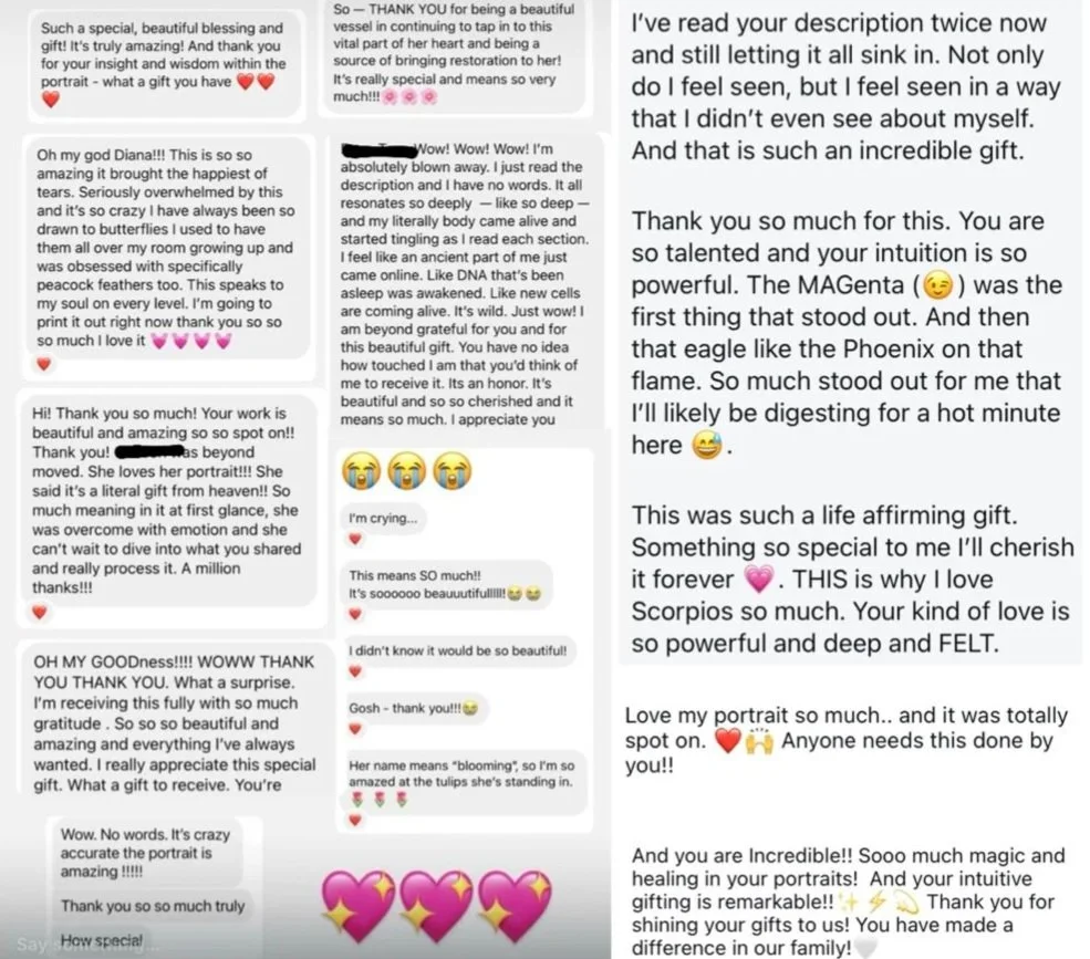 A divinely channeled digital art piece infused with healing energy. I connect to your energy and create a piece that allows your true soul essence, along with any animal totems and signs from Spirit, to come through. Once the portrait is finished, you’ll also receive a write-up with the main themes and any other messages.